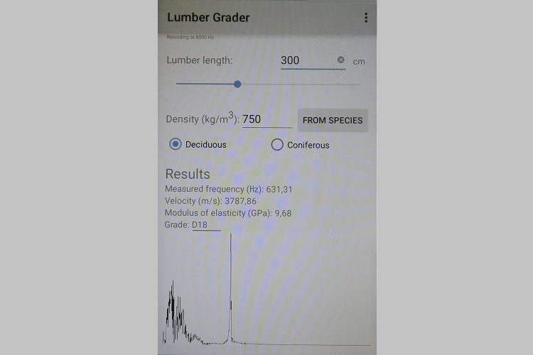 共振木材分级计是一个简单的工具。它由一把锤子和一个带有专门软件的Android手机或平板电脑组成。用户输入长度、选择树种,木材分级计将采用该树种的平均密度,用于可以覆盖已有的密度值。然后敲击木材的端部基于EUROCODE338标准的分级即显示在屏幕上。由于密度的不确定性,该分级仅作为参考信息。