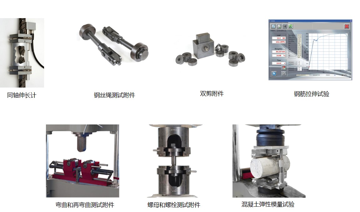 全系列配件:可进行各种试验,包括引伸计、钢的横向和弯曲试验装置、混凝土的压缩-弯曲和间接拉伸试验等。