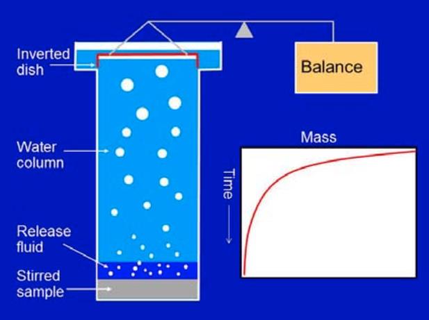 通过水柱上升的气泡被收集到一个倒置的皿(浮皿)中,这个皿是浸在水中并且连接到一个灵敏的天平。当气泡聚集在皿上时,由于水被空气替代,皿的表观质量会降低。皿的表观质量会随时间记录下来。